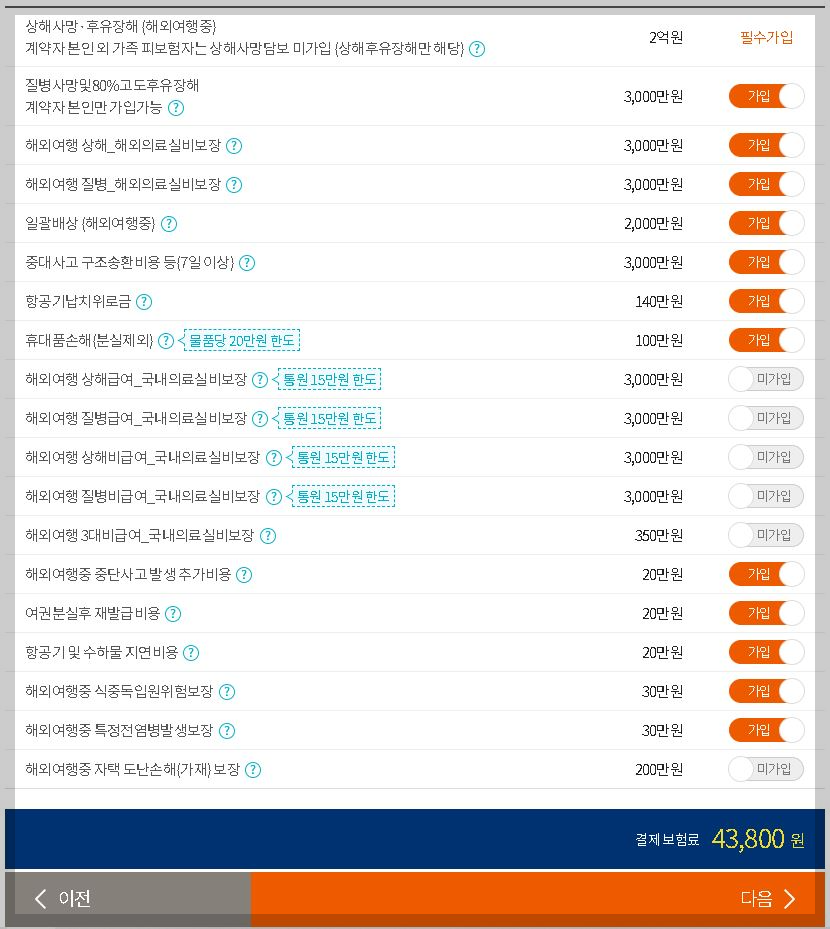 여행을 가 있는 동안 집에 도둑이 들어올 확률은 거의 없다고 판단되어서 [해외여행중 자택 도난손해보장]은 미가입하였습니다.