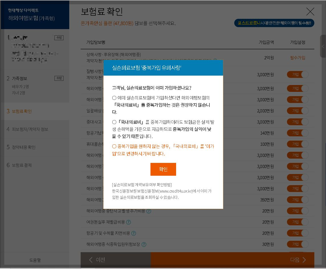 국내 실손 보험에 가입 중이라면해외여행보험의 [국내의료비]를 중복가입하는 것을 권장하지 않는다는 창이 뜹니다. 그래서 저는 국내의료비 부분은 가입하지 않았습니다.